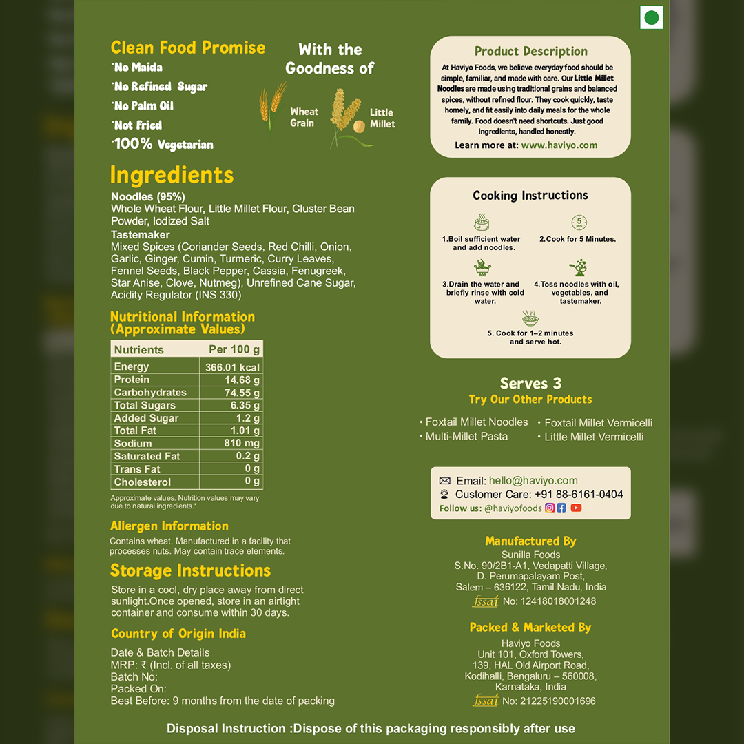At Haviyo Foods, we believe everyday food should be simple, familiar, and made with care. Our Little Millet Noodles are made using traditional grains and balanced spices, without refined flour. They cook quickly, taste homely, and fit easily into daily meals for the whole family. Food doesn't need shortcuts. Just good ingredients, handled honestly.