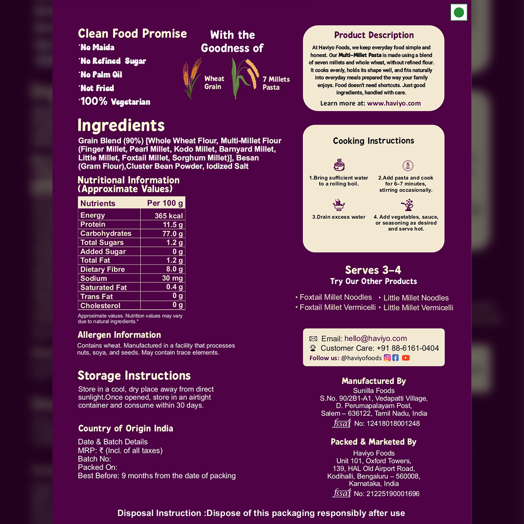 At Haviyo Foods, we keep everyday food simple and honest. Our Multi-Millet Pasta is made using a blend of seven millets and whole wheat, without refined flour. It cooks evenly, holds its shape well, and fits naturally into everyday meals prepared the way your family enjoys. Food doesn't need shortcuts. Just good ingredients, handled with care.